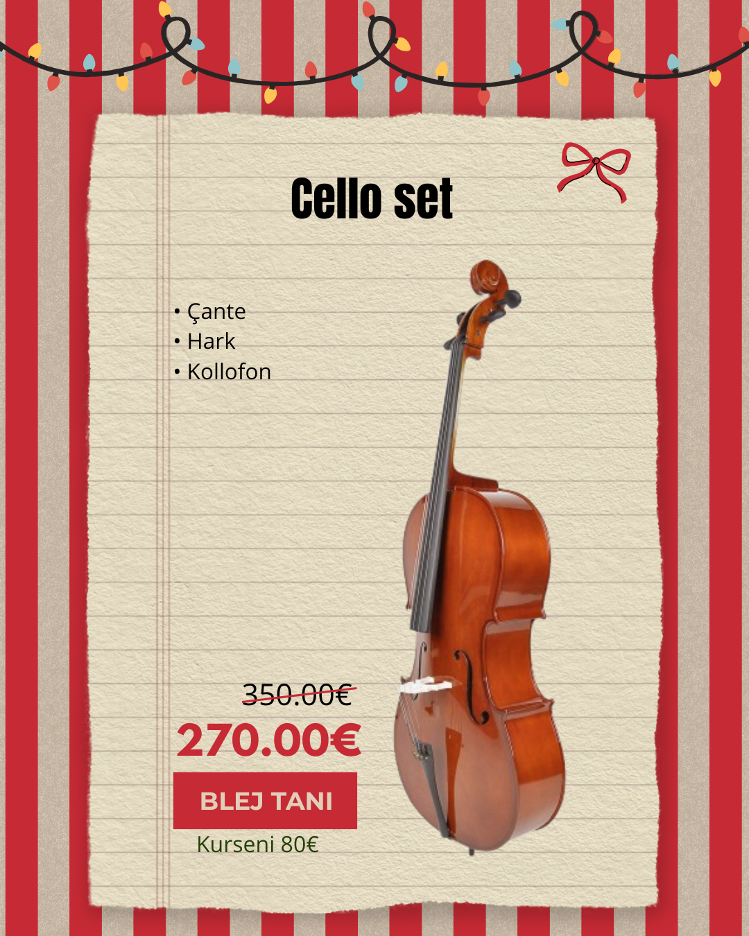Cello per student – në madhësitë 1/2 dhe 3/4, ideale për mësim dhe prova dhe koncerte.